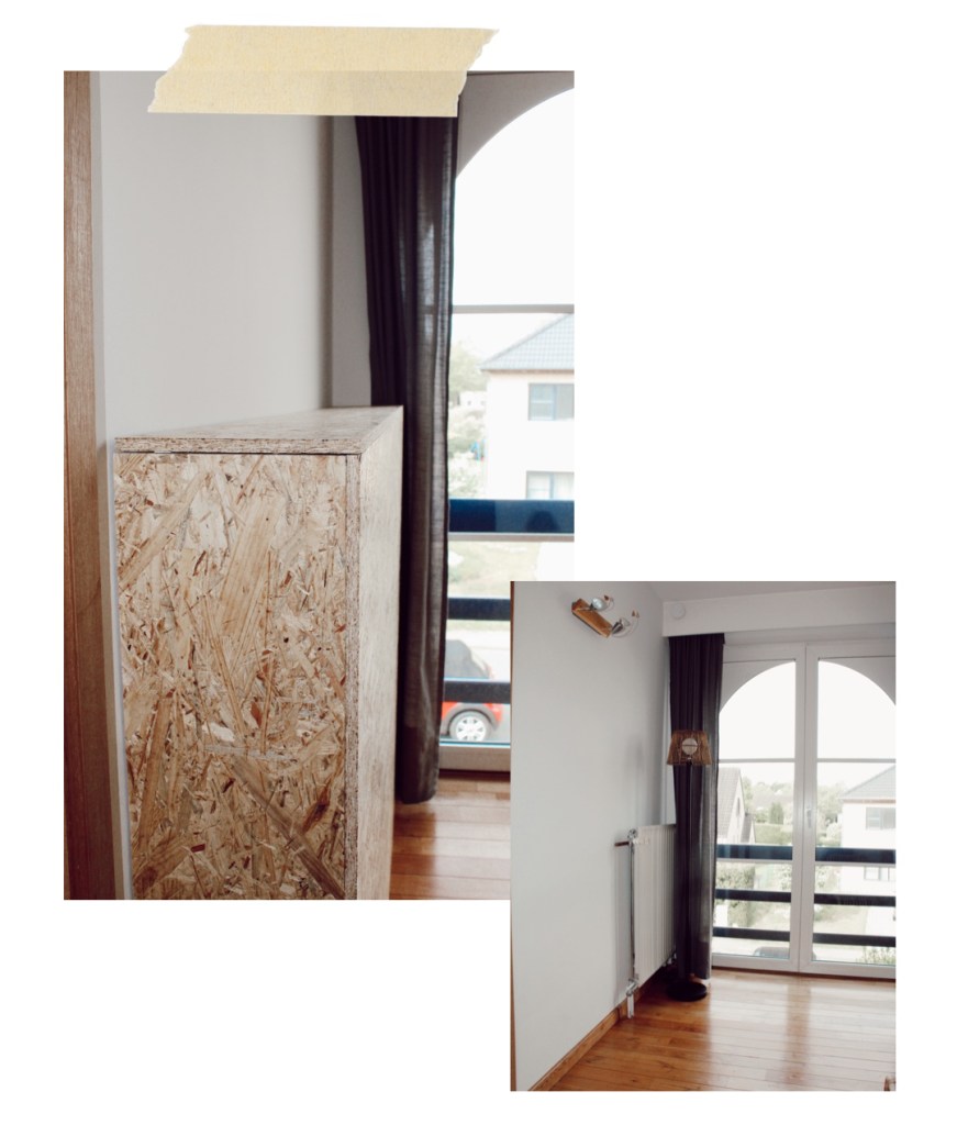Créer un caisson pour dissimuler le radiateur. Il ne devra pas être fixé au mur pour pouvoir l’écarter en cas de grand froid car, oui, malheureusement nous habitons en Belgique et pas sous les tropiques…