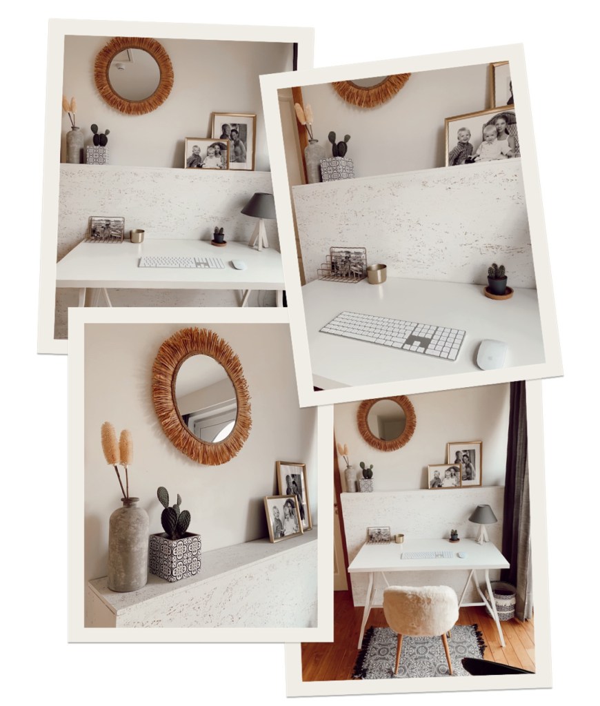 Je n’avais jamais pris le temps de me créer un espace de travail dans la maison. J’avais bien tenté d’aménager un petit bureau sur notre immense palier à l’époque où on avait emménagé dans la maison mais celui-ci donnait tout sauf l’envie de travailler! Ce bureau avait donc terminé par servir de vide poche, de repose vêtements mais ne remplissait pas du tout son rôle premier…